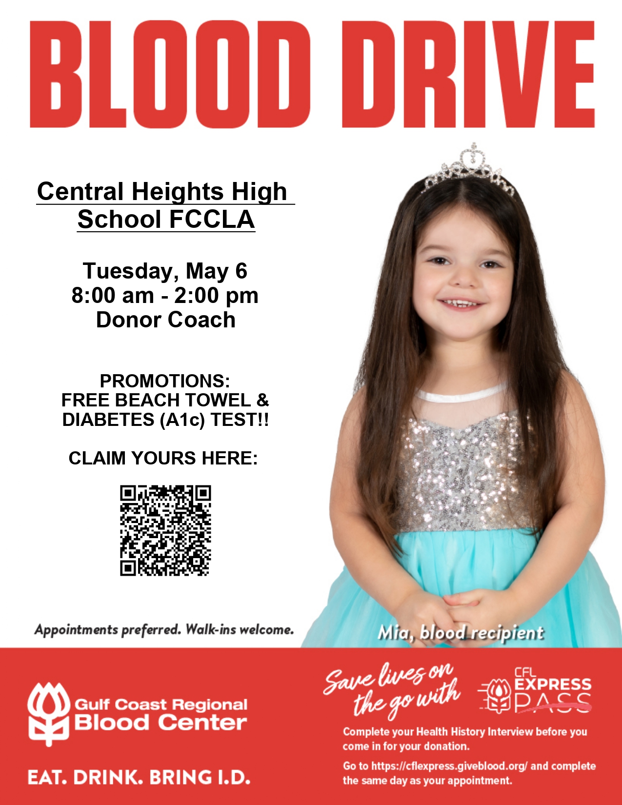FCCLA is proud to sponsor a Blood Drive on Tuesday, May 6th, and we need YOU to help make a difference!